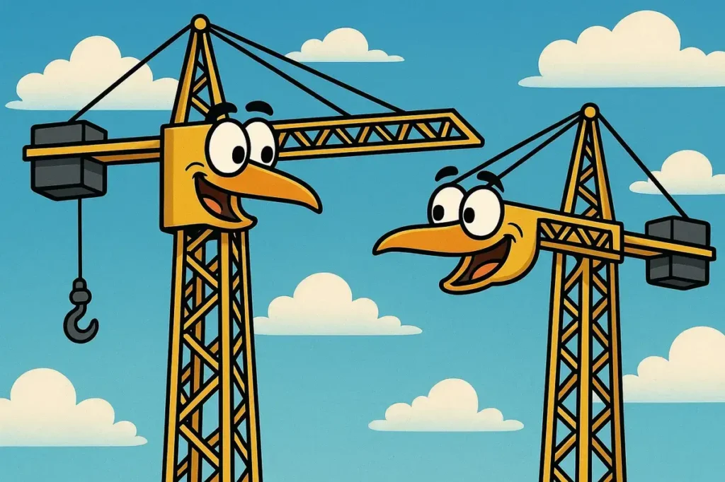 - Cranes gossip with rooftops daily.